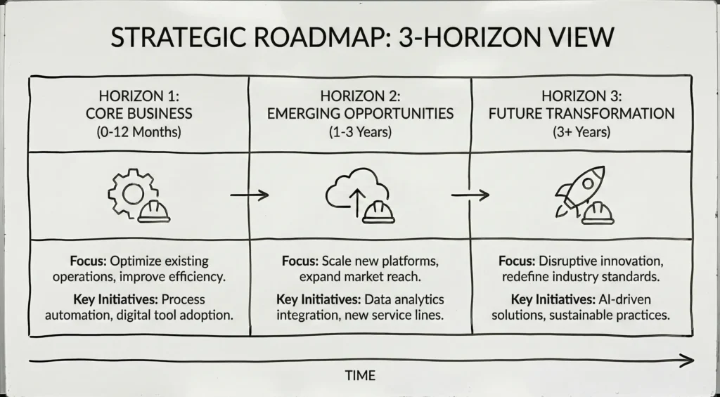 - Horizon 1 (Current – Efficiency): Solve the Data Gap. Bridge field reality with back-office requirements.