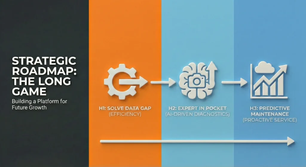 - Horizon 2 (V2 – Intelligence): ‘The Expert in the Pocket.’ AI-driven diagnostics delivering repair recommendations based on historical photographic data of similar equipment.