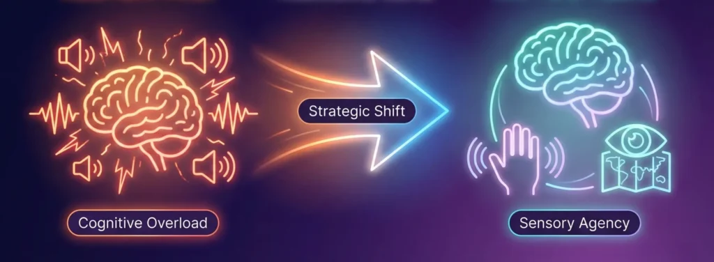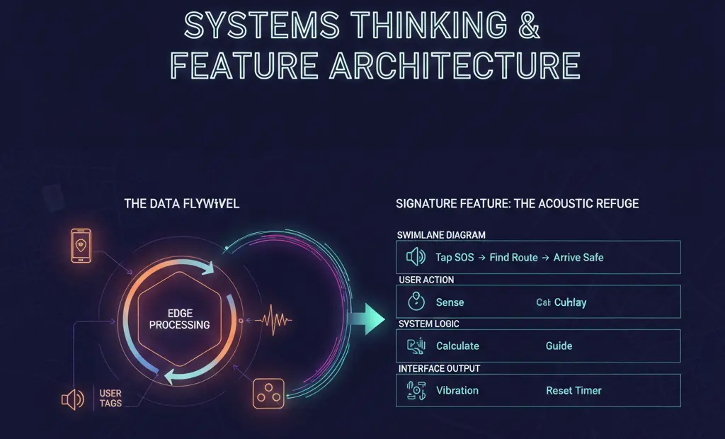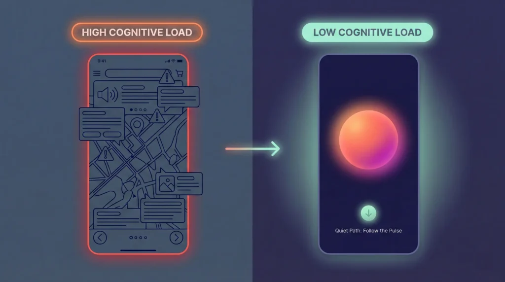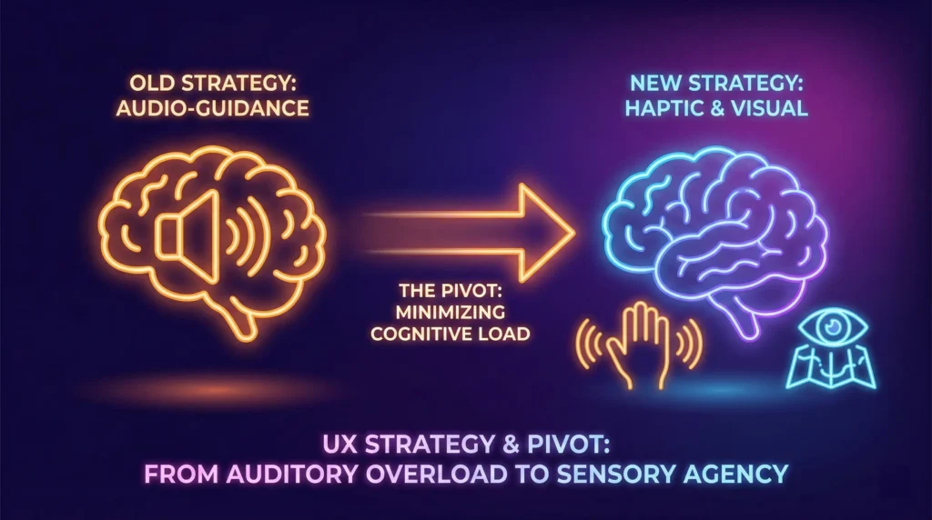 The Decision: We pivoted to a Haptic-First & Visual-Heatmap strategy. By offloading navigation to the sense of touch and sight, we preserved the user’s limited auditory ‘bandwidth’ for safety and conversation.