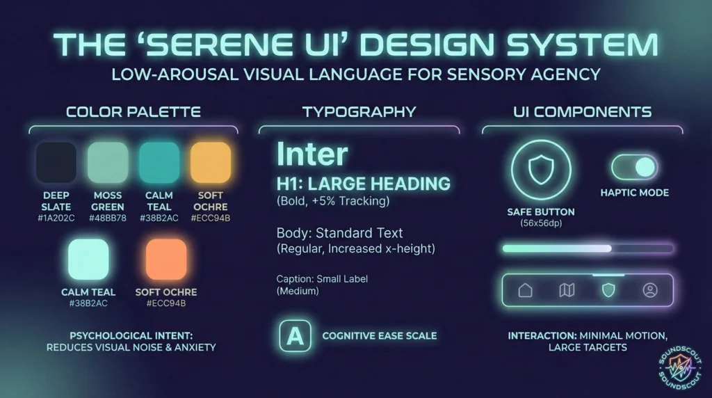 • Chromotherapy: Used a palette of Deep Slates and Moss Greens. We explicitly avoided ‘Alarm Red’ to keep user cortisol levels low during stressful navigation.
