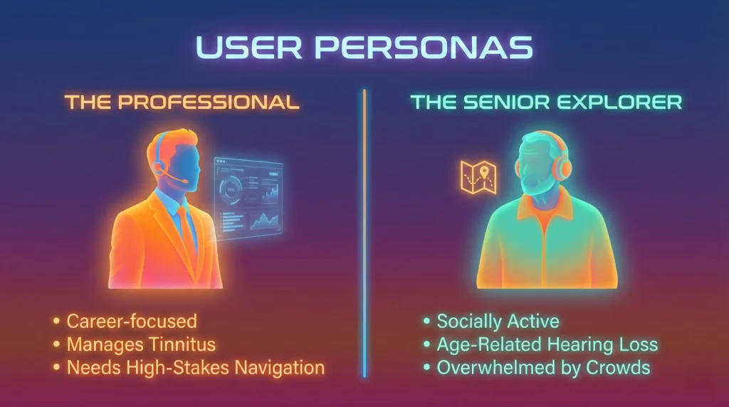 • The Senior Explorer: Wants to remain socially active but is overwhelmed by the ‘Cocktail Party Effect’ in public venues.