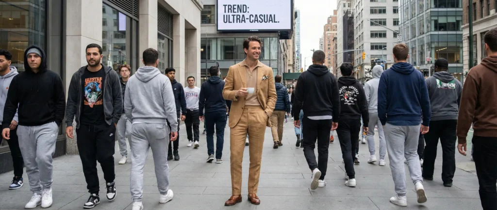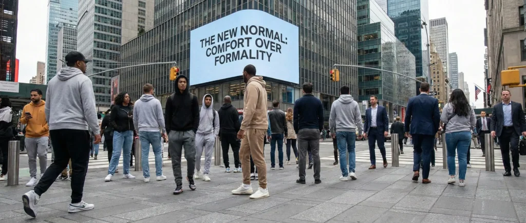 Look around. The rigid dress codes of the past have eroded into a universal uniform of stretch fabrics, elastic waistbands, and footwear originally designed for running marathons, now used for running errands. ‘Business casual’ has dissolved into ‘Zoom-appropriate from the waist up’.
